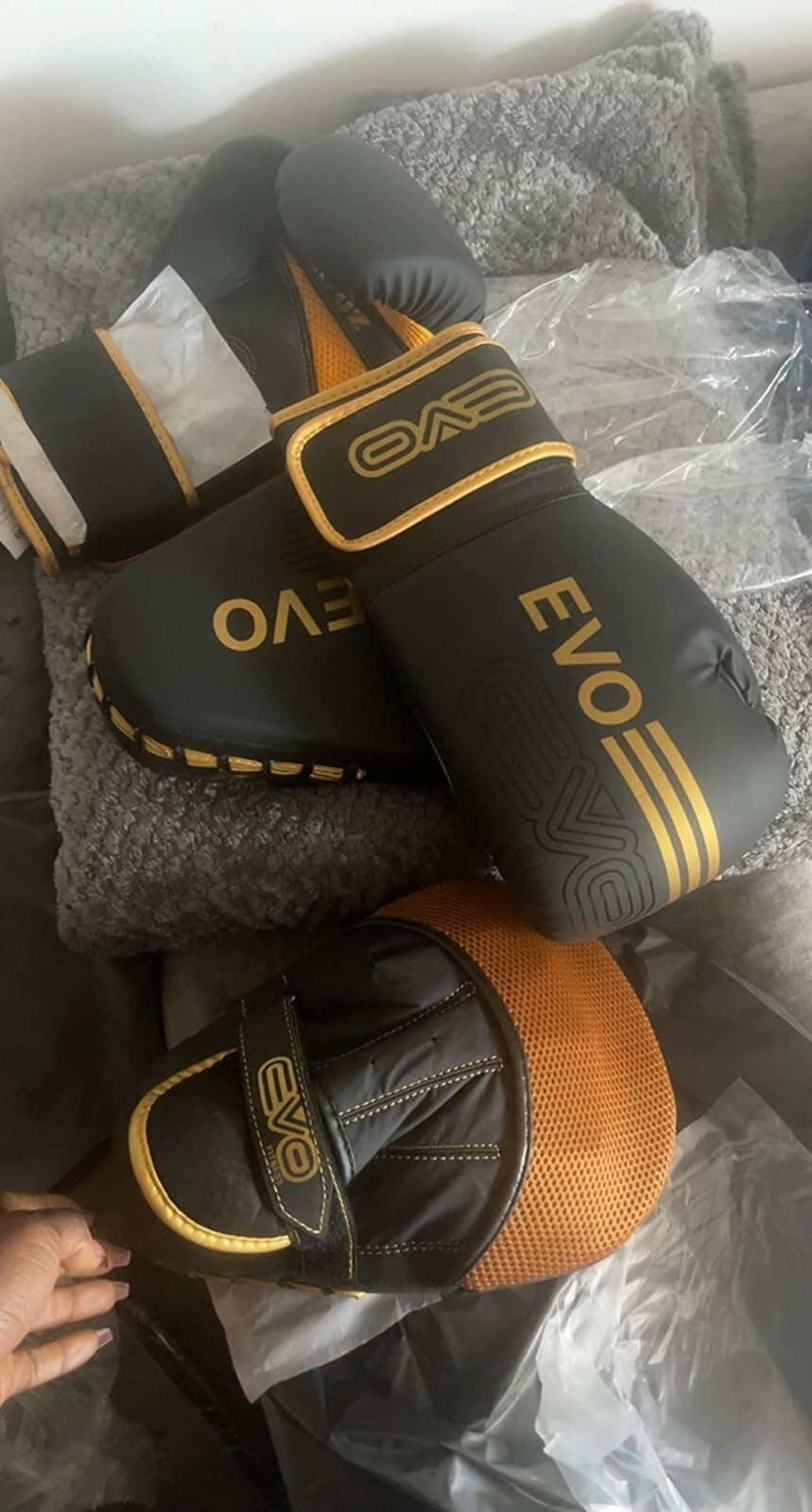 EVO Fitness Matte Black Boxing Gloves and Pads Set. This is the first time I have purchased a pads and gloves set and it certainly has lived up to my expectations.